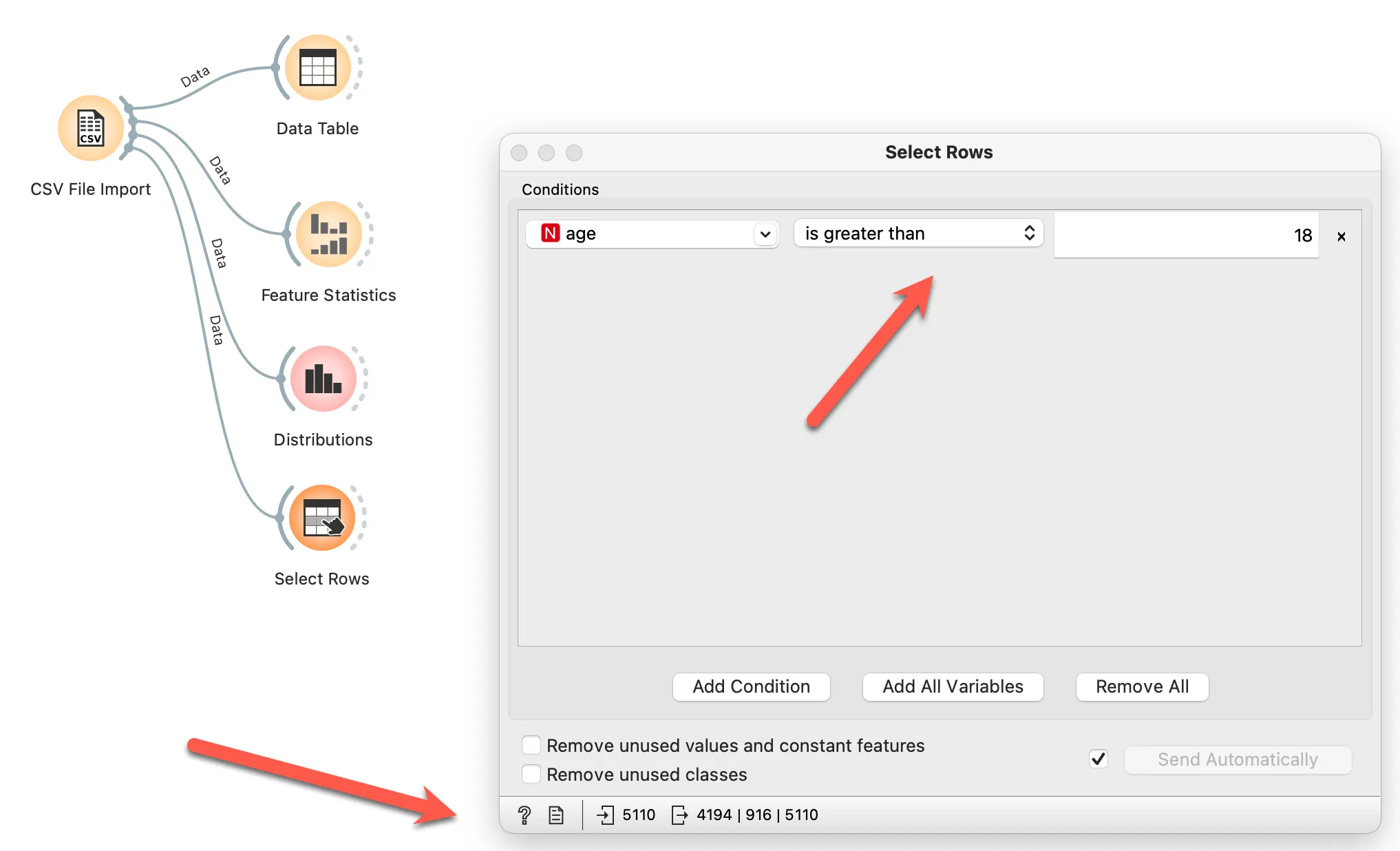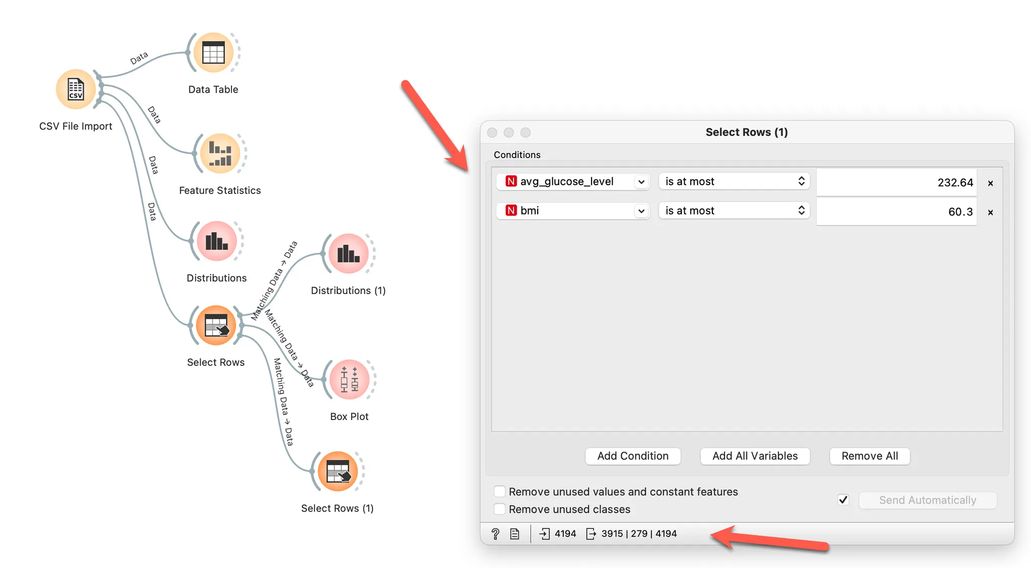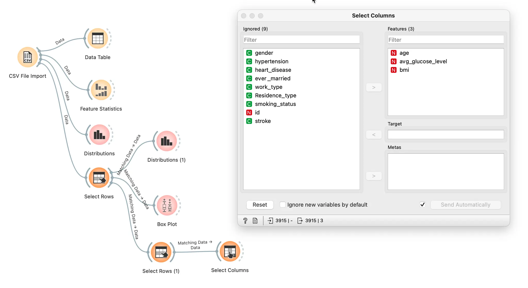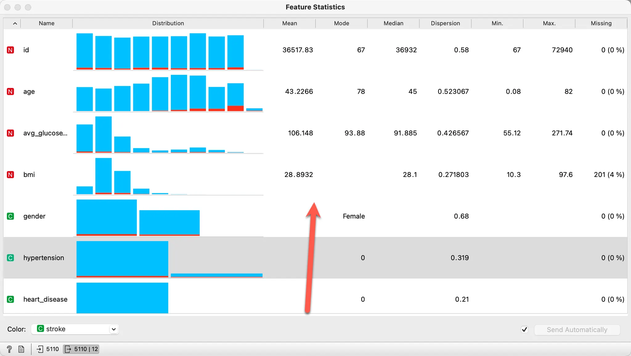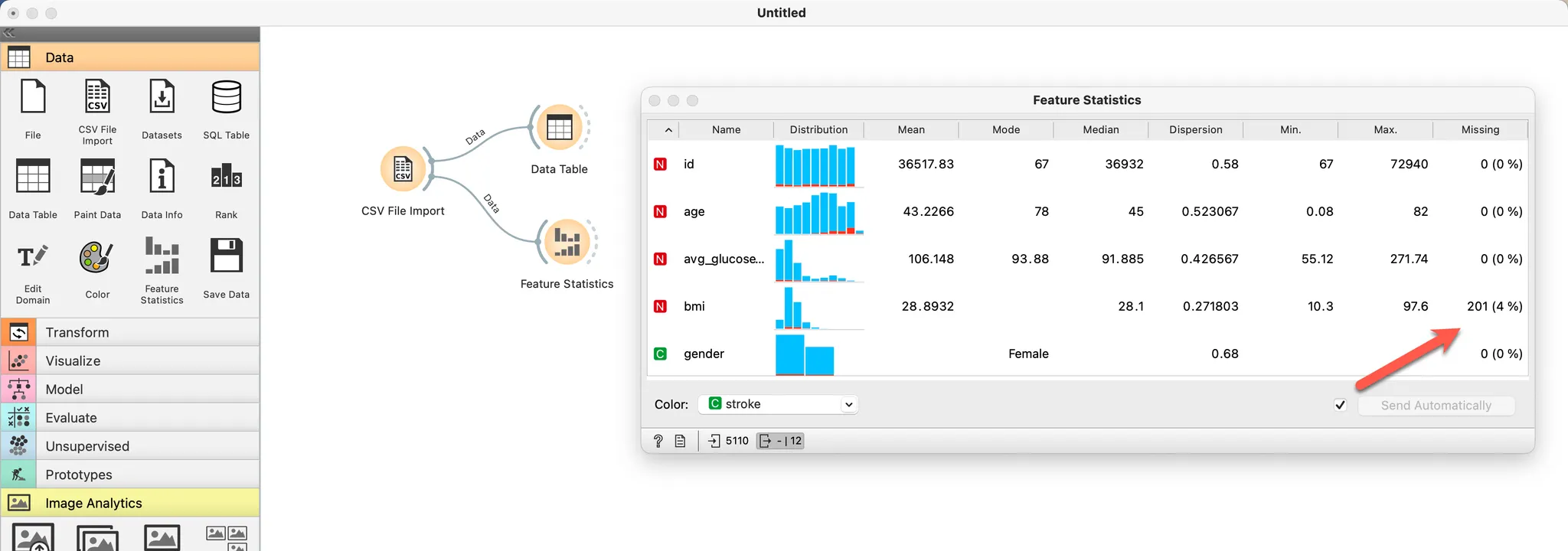 어떤 속성에 결측값이 있을까요? Feature Statistics 위젯을 이용하면 알 수 있습니다.
