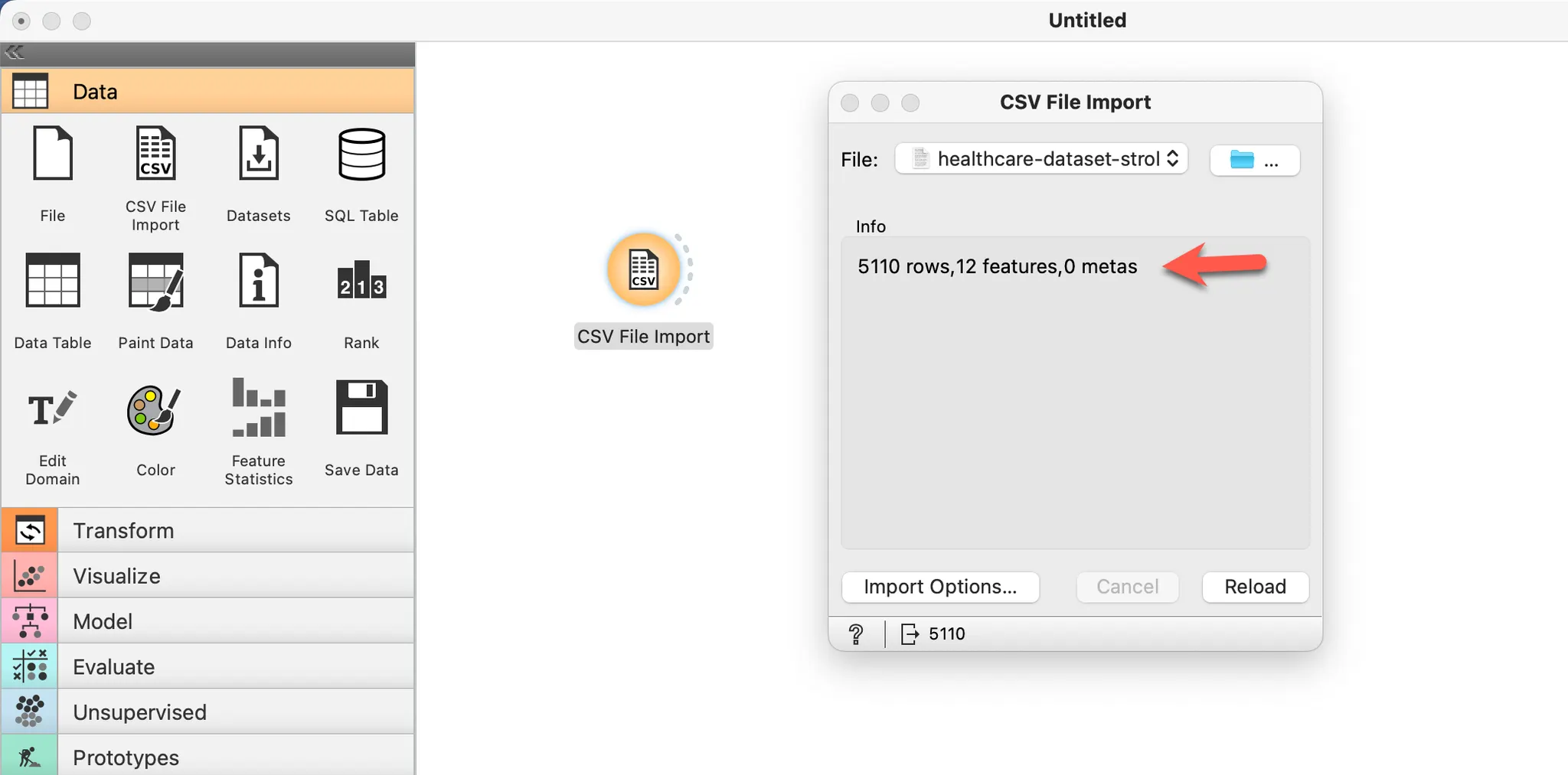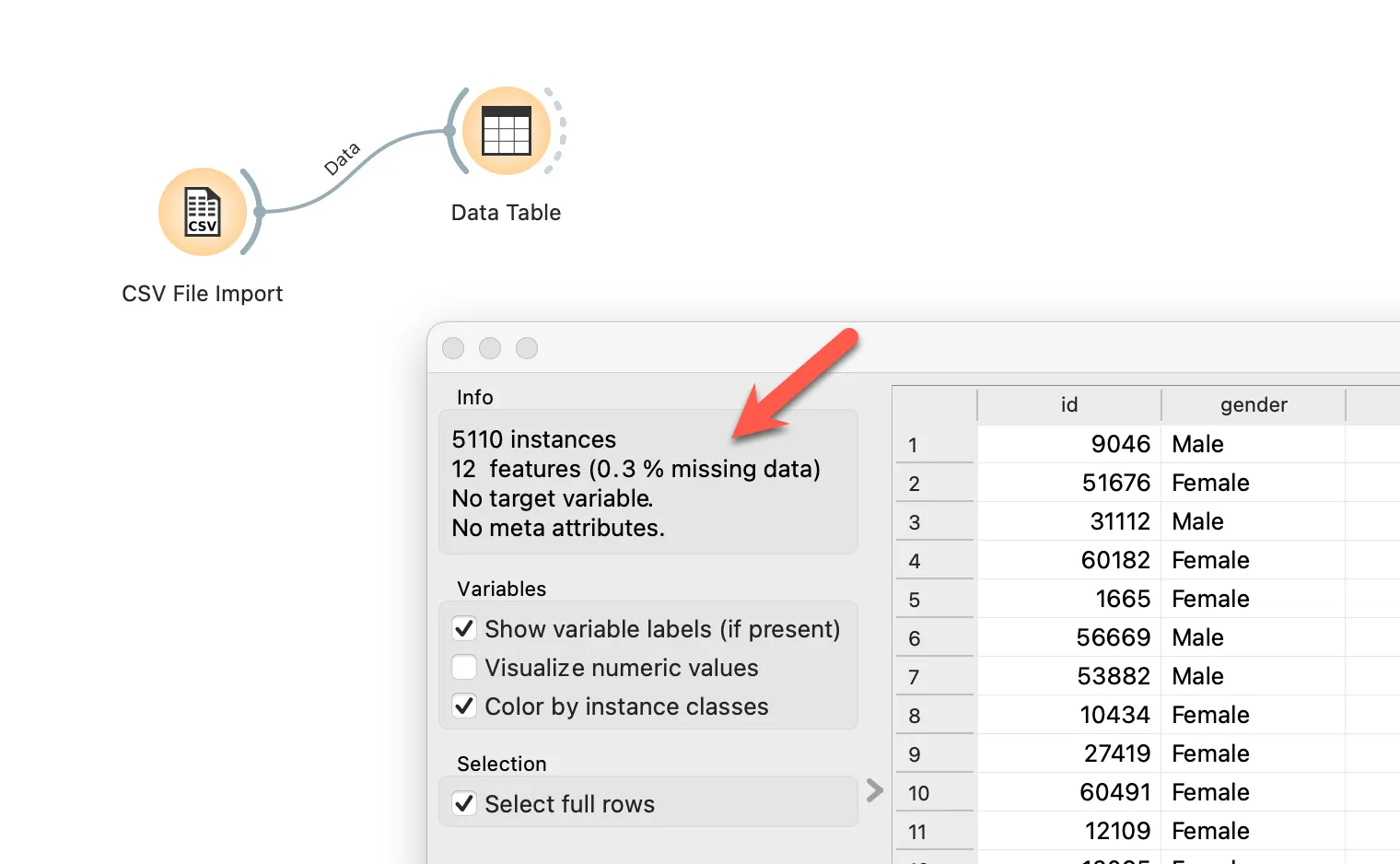 Data Table 위젯을 통해 데이터를 살펴 보면 12개의 속성, 전체 데이터의 0.3%가 결측값이라는 것을 알 수 있습니다.