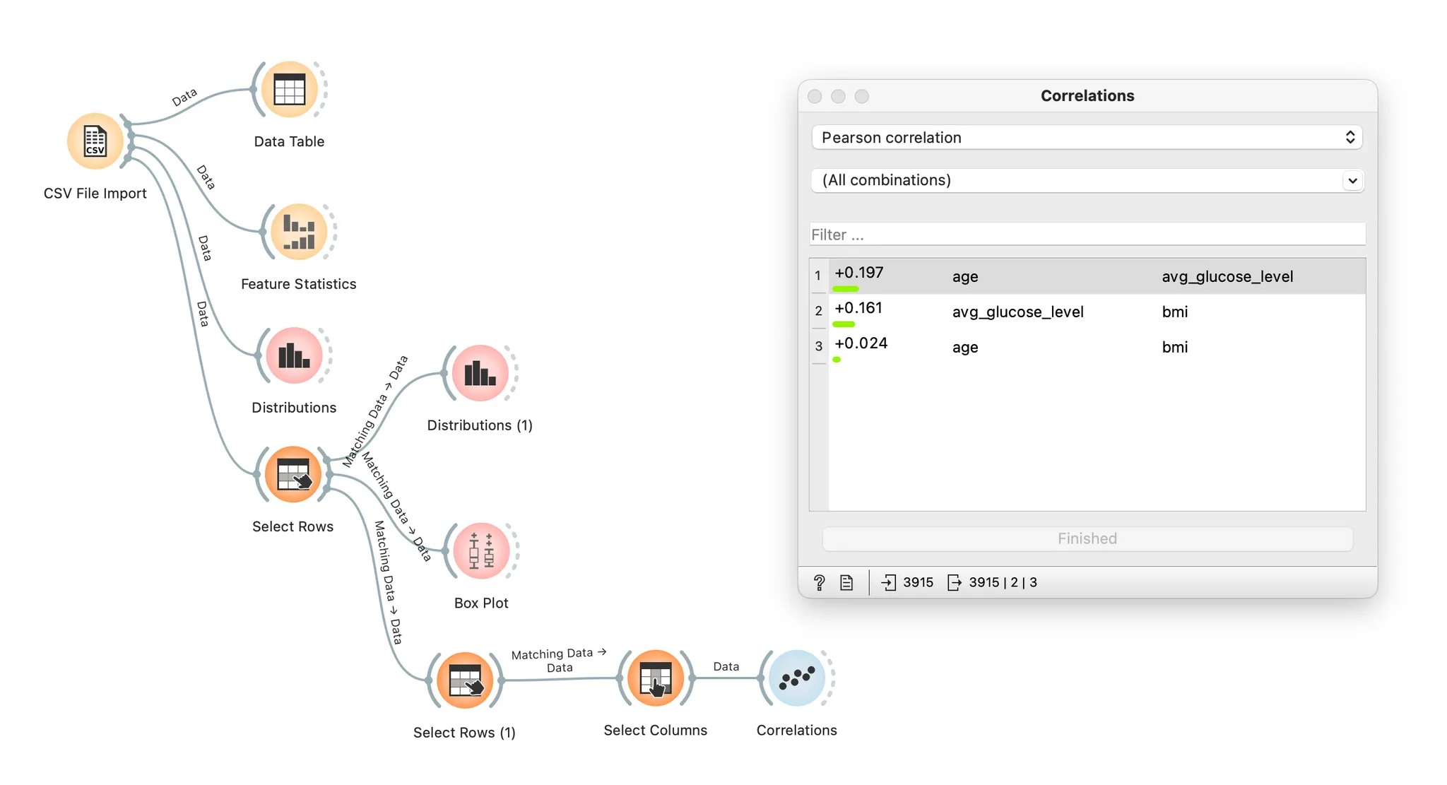 숫자형 컬럼 3개를 선택한 후 Correlations 위젯에 연결하여 결과를 살펴보니 세 변수 간의 상관계수가 각각 +0.197, +0.161, +0.024로 절대값이 모두 0.7미만입니다.