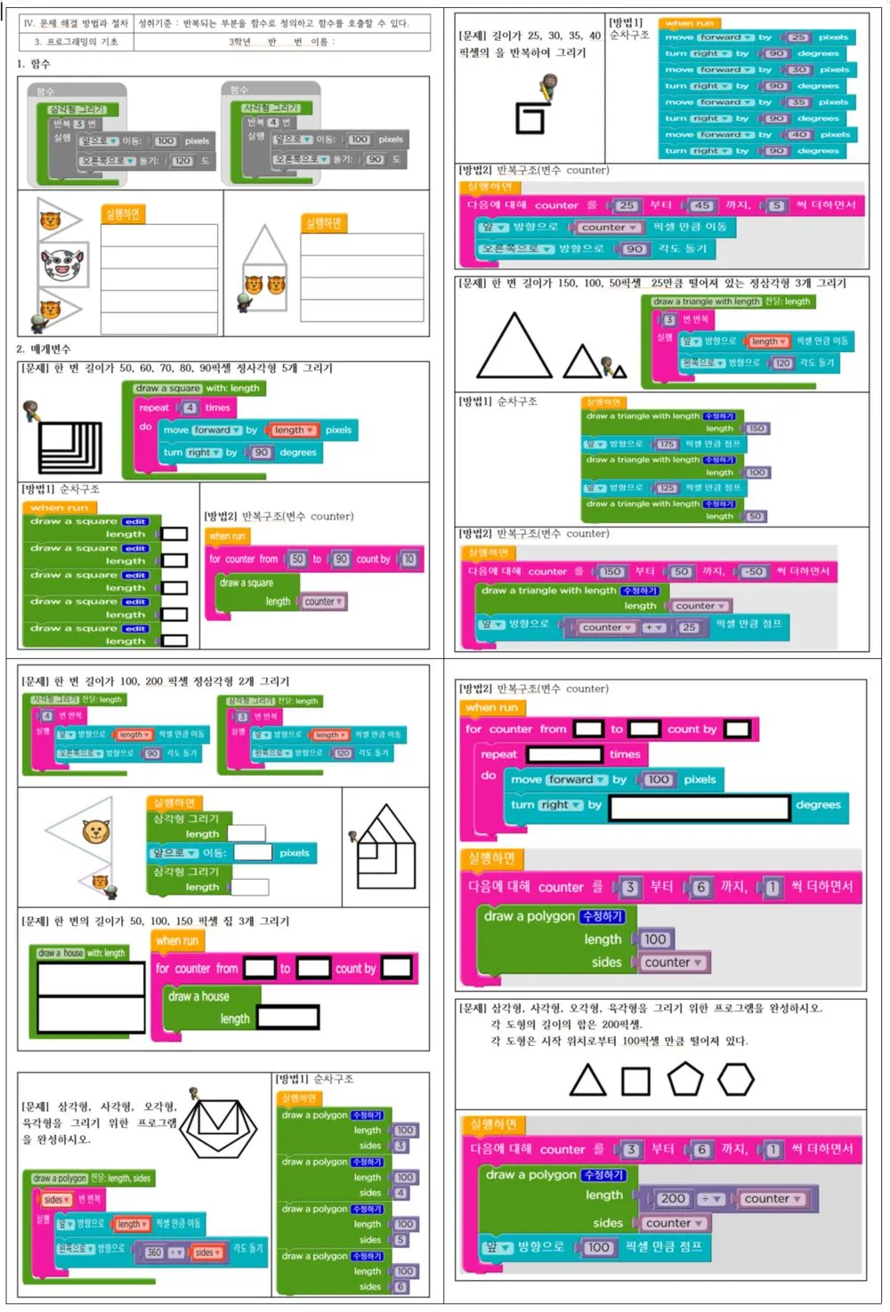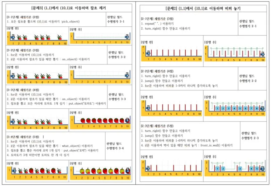 수행평가는 한 문항에 대해 순차, 반복, 함수, 변수를 사용하여 단계별로 문제를 해결하도록 제시한다.