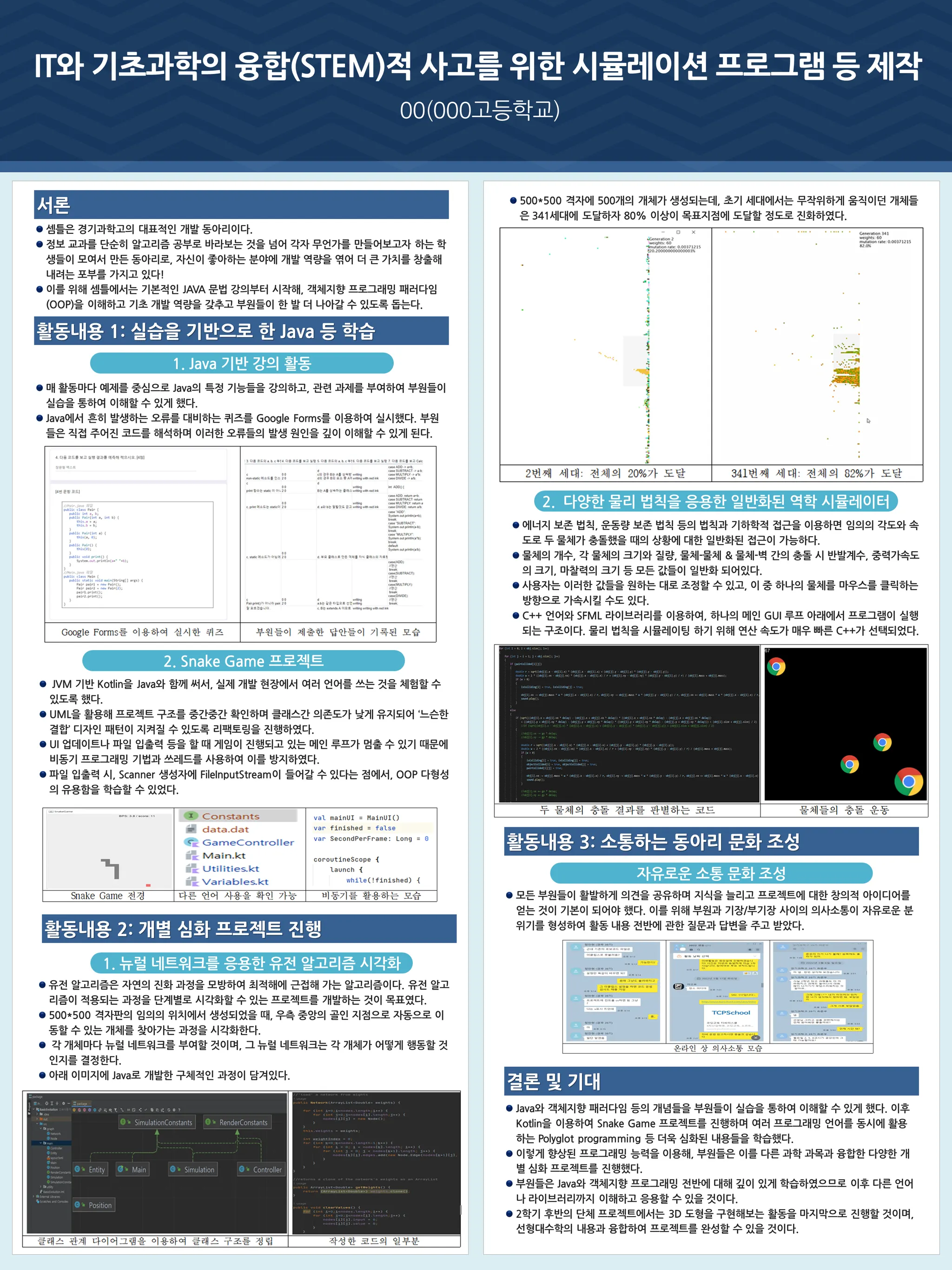 코틀린으로 간단한 앱 만들기, 자율주행 코딩, vpython을 활용한 과학 실험, 파이게임을 활용한 각종 게임들, 파이썬으로 인공지능 모델 만들기, atcoder나 외부 소프트웨어 대회 참가 등 많은 결과물들이 나와 굉장히 뿌듯했습니다.