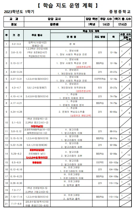 일단, 1학기 진도 계획을 Ⅰ. 정보문화 , Ⅲ. 문제해결과 프로그래밍 - 추상화와 알고리즘, 프로그래밍-2. 입력과 출력까지로 잡았습니다.