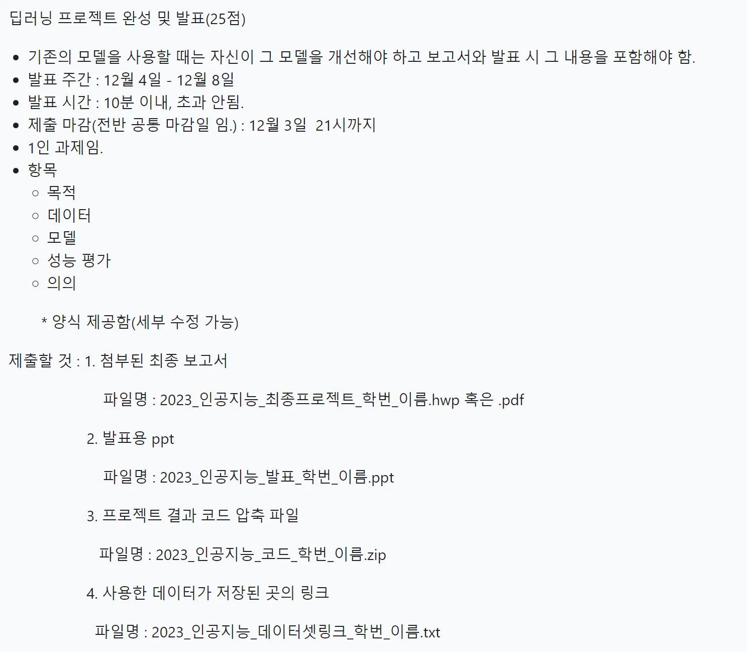 프로젝트 완성의 기준은 ‘데이터-모델학습-모델 평가-결과 분석’까지로 잡았습니다. 1인 1작품으로 진행했고, 학생 전원이 계획서 발표와 결과 발표를 하였습니다. 계획서 발표는 공유의 목적도 있지만, 기간 안에 프로젝트를 완성할 수 있을지 보기 위함이었습니다.
