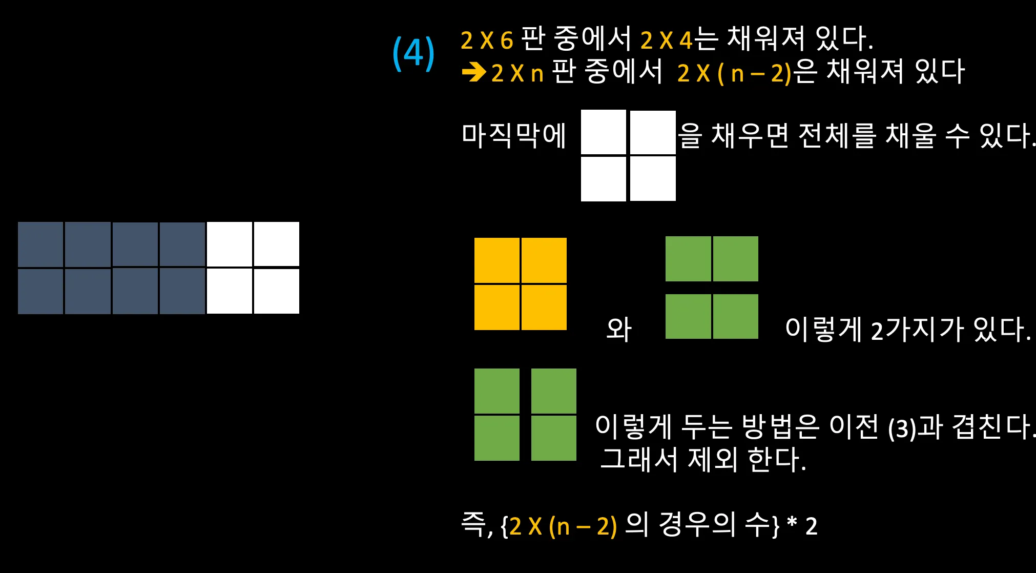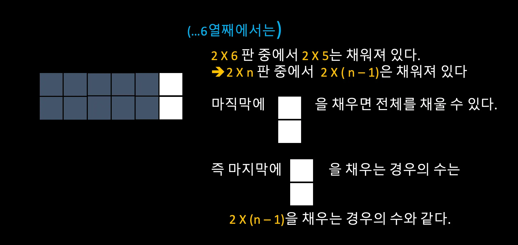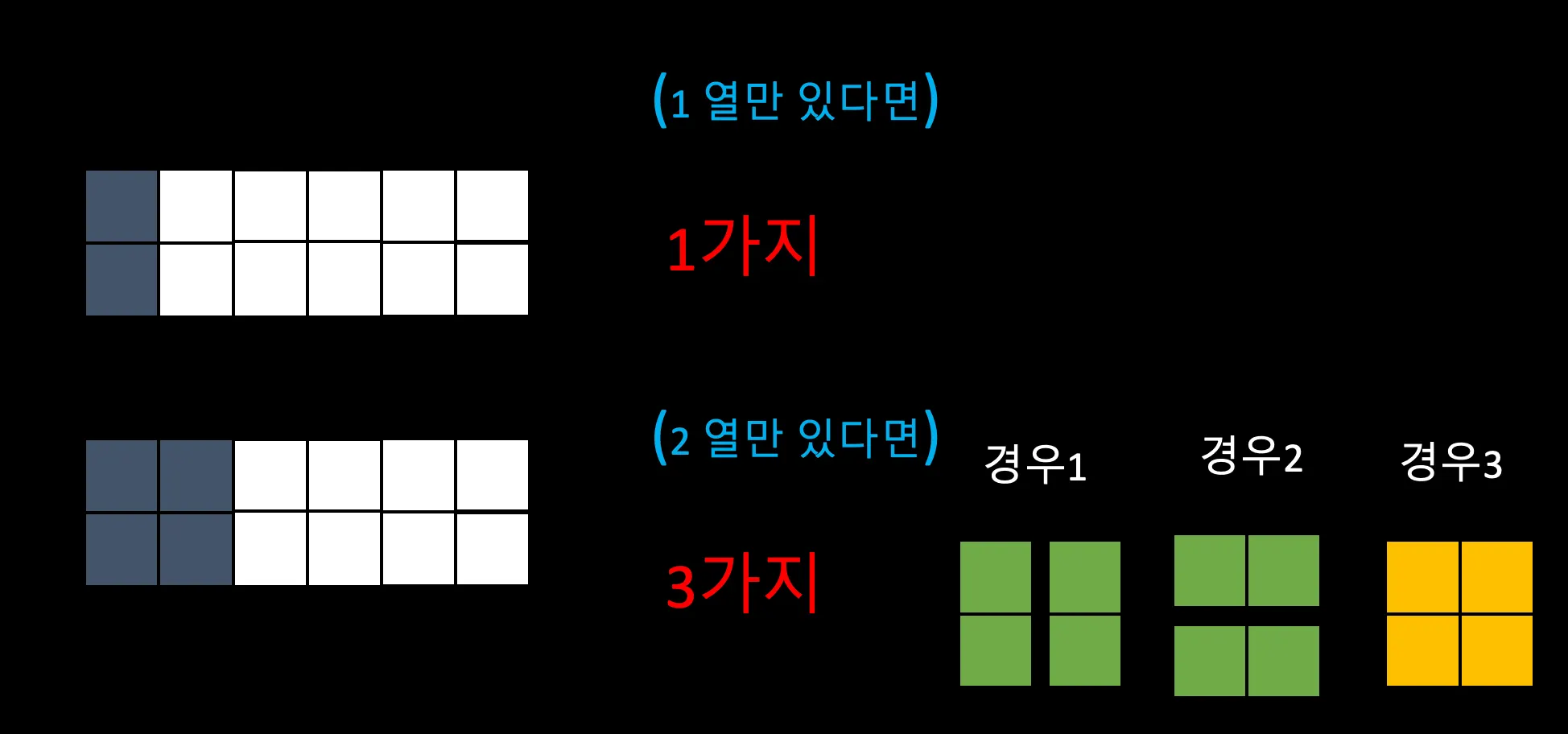 세로는 2행으로 고정되어 있고 옆으로 열이 늘어나는 빈 타일을 1X2, 2X1, 2X2 모양의 블록을 이용해서 채울 수 있는 경우의 수를 구해보자.