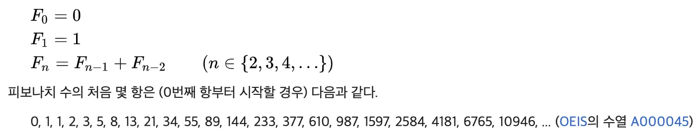 피보나치 수열에 대한 정의는 아래 그림과 같습니다.