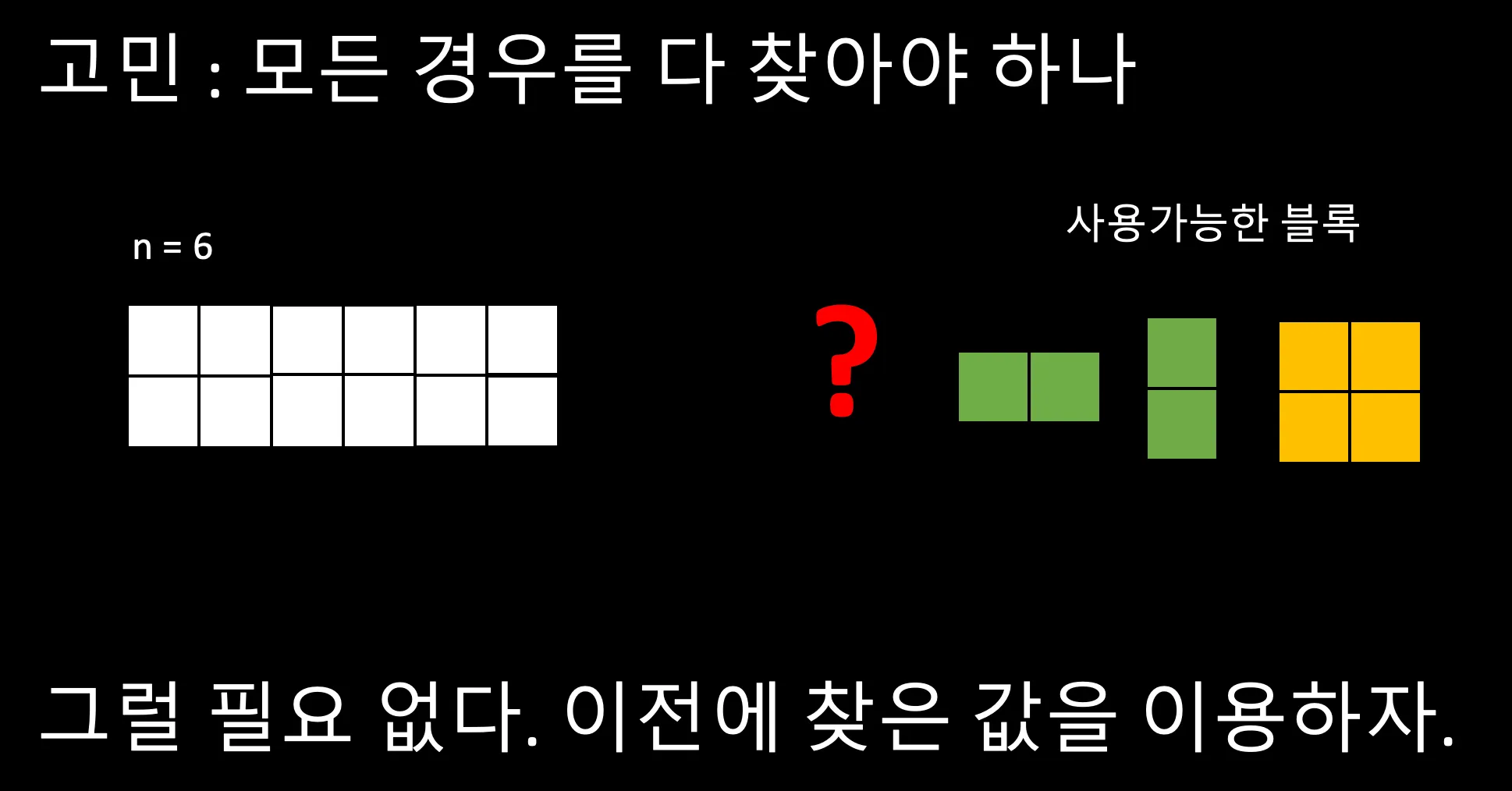 동적 계획법은 어떤 문제를 풀기 위해 그 문제를 더 작은 문제의 연장선으로 생각하고, 과거에 구한 해를 활용하는 방식으로 간단히 말해 부분에서 구했던 답을 다음 단계에서 다시 이용하는 문제 해결 방법이라고 할 수 있습니다.