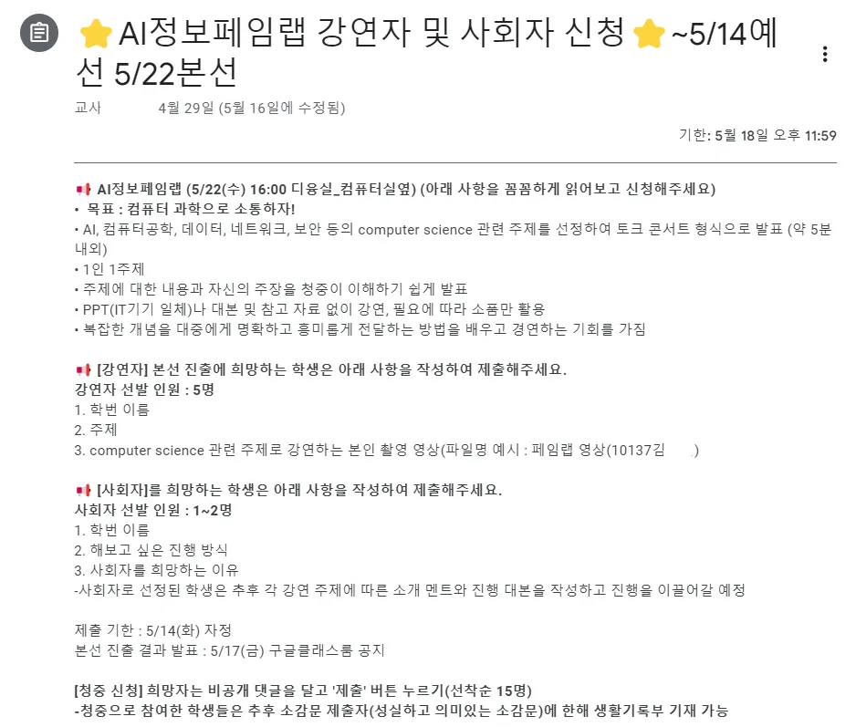 학기 초에 정보 관련 행사를 안내하고 참여할 수 있도록 전교생 대상으로 클래스룸을 만들어 두었어요. 그리고 각 학급에 안내를 하고 클래스룸에 공지를 올려 학생들이 참여할 수 있도록 독려하였습니다. 강연자로 신청을 받을 때는 페임랩의 취지에 맞게 학생이 직접 말로 설명하는 영상을 제출하도록 하였으며 그 영상을 본 후 5명의 강연자를 선정하였습니다.