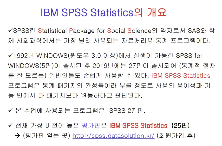SPSS는 통계분석과 데이터 마이닝에 특화된 통계 분석 프로그램입니다. 아마 논문을 작성해 보신 선생님들께서는 사용한 경험이 있으실 것 같습니다.