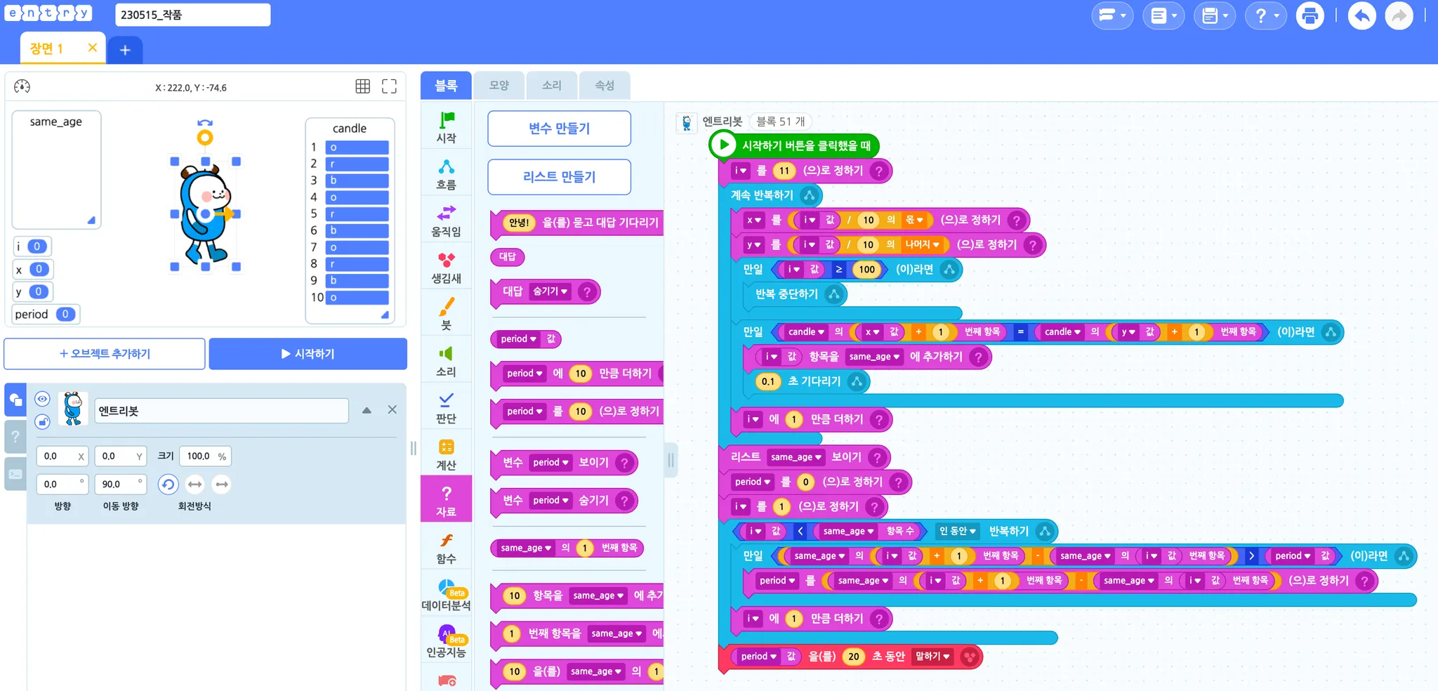 엔트리 역시 파이썬과 마찬가지로 리스트를 활용하여 candle 리스트에 양초의 색상 정보를 저장한 후 11부터 99까지 모든 경우를 살펴보고 same_age 리스트에 추가합니다. 단, 엔트리는 파이썬과 달리 리스트의 인덱스가 0번이 아닌 1번부터 시작하므로 넘버링할 때 이 부분을 꼭 기억하고 코드를 작성해야 합니다.