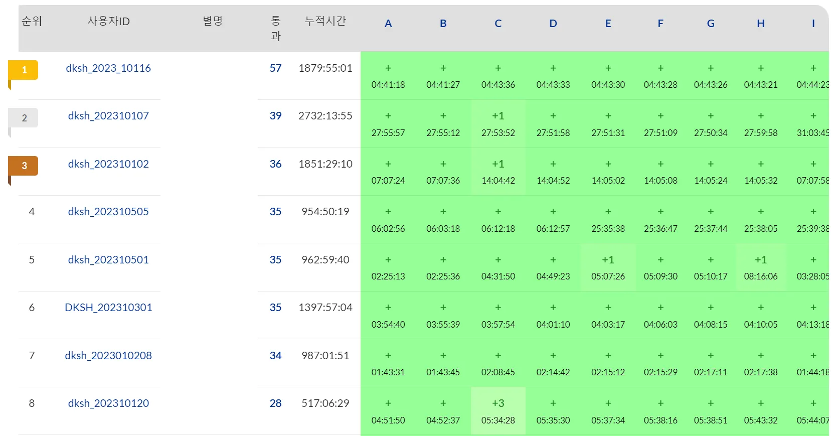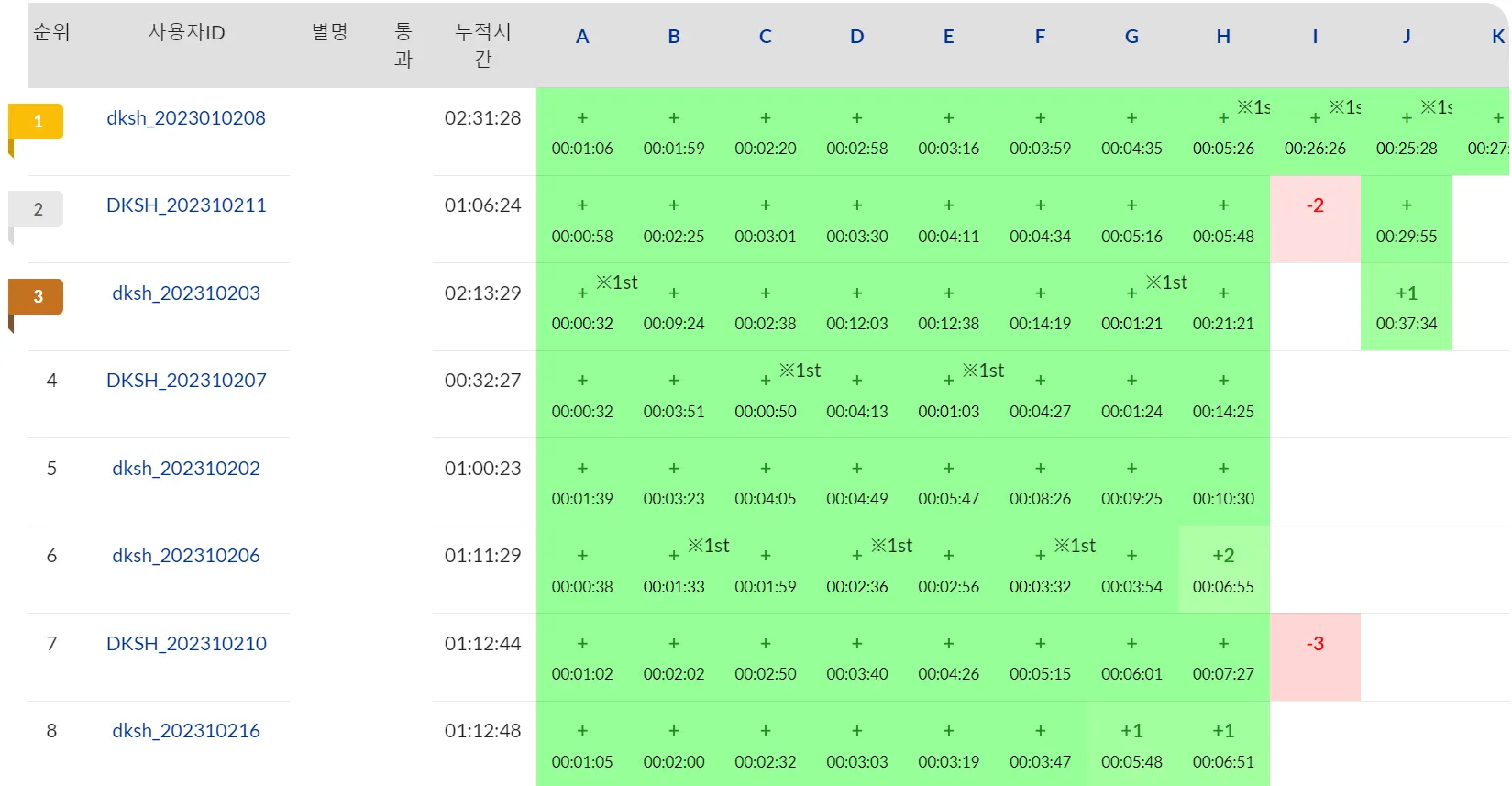 아래는 5월에 1시간 동안 오프라인으로 개최했던 대회의 순위표입니다.