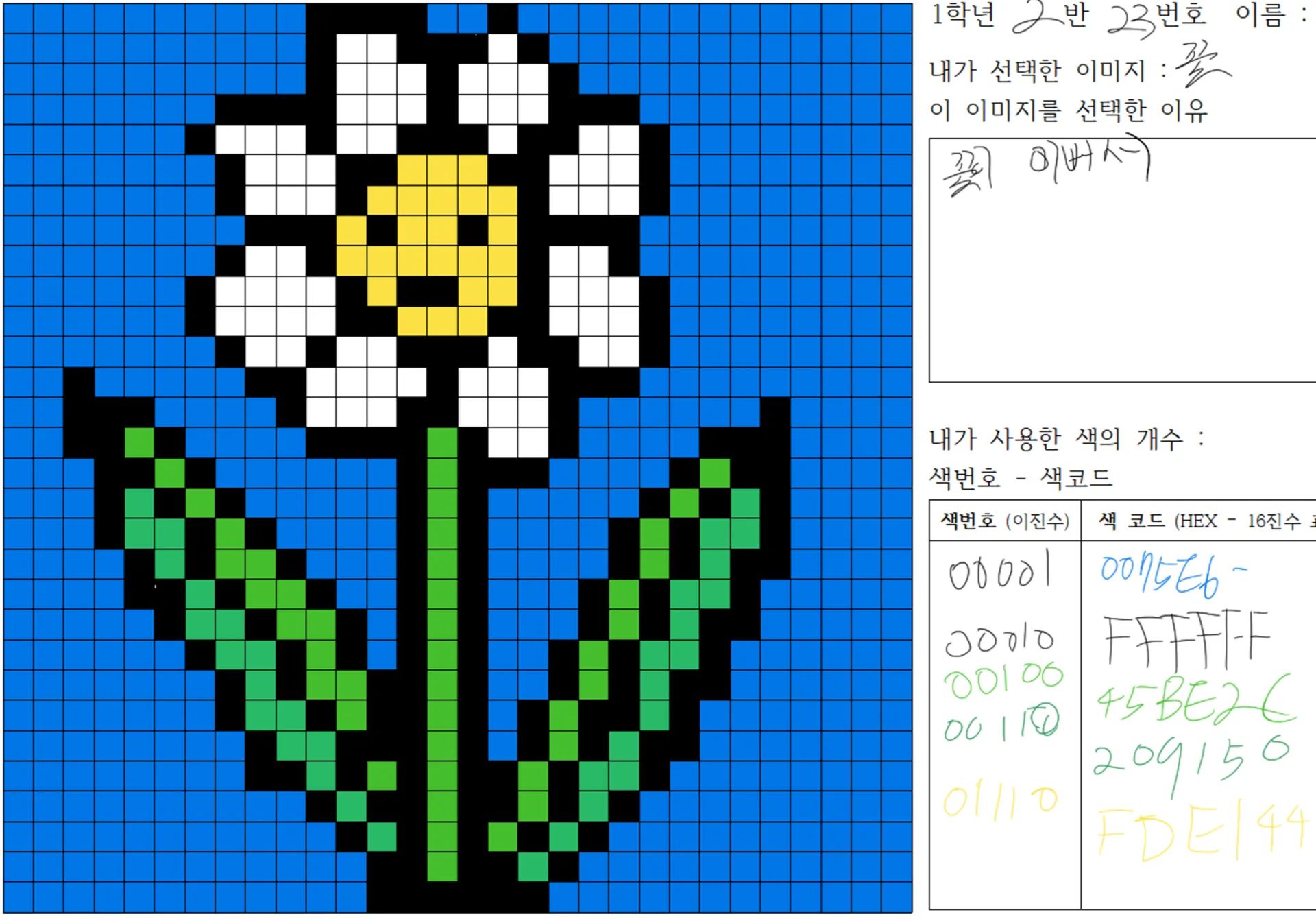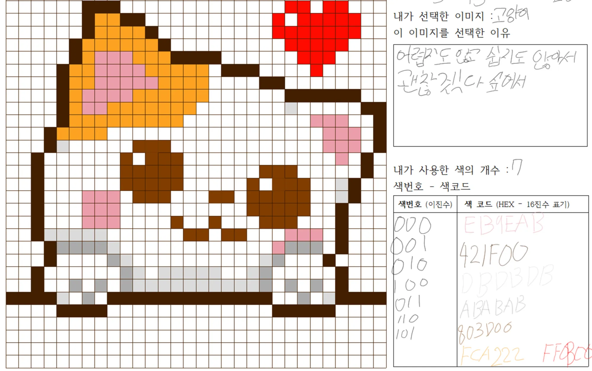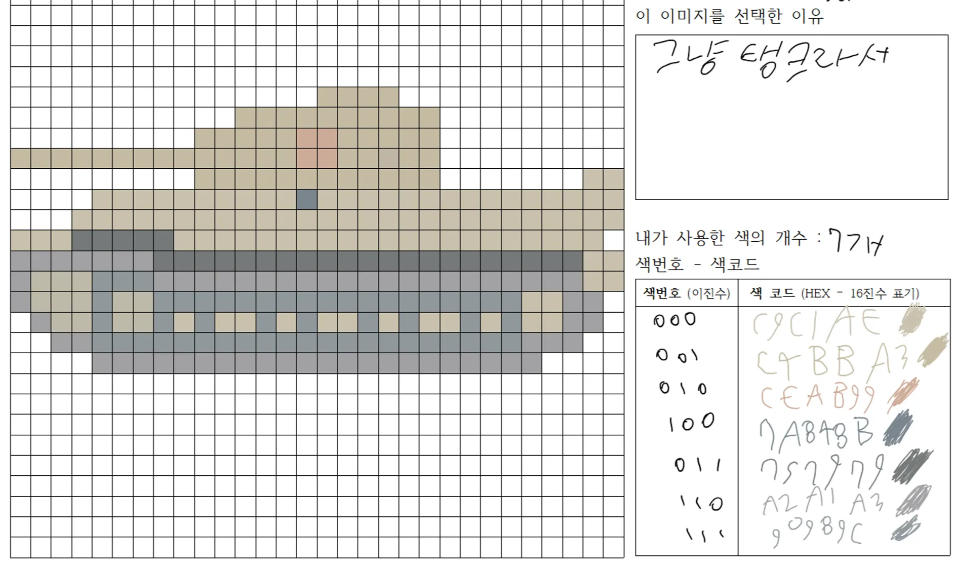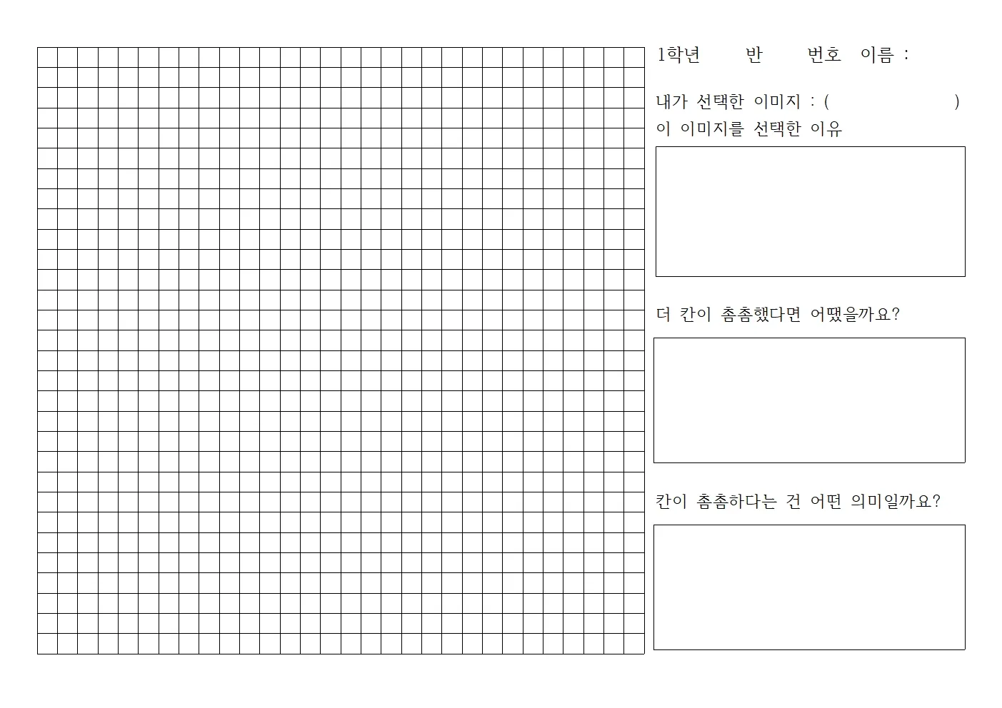 그림이 완성되면, 학생이 활동지 오른쪽의 빈칸에 내용을 작성하도록 안내합니다. 학생들은 해당 그림을 선택한 이유, 내가 사용한 색, 칸이 촘촘하면 어땠을 것 같은지 등의 질문에 대한 답을 작성하게 됩니다.