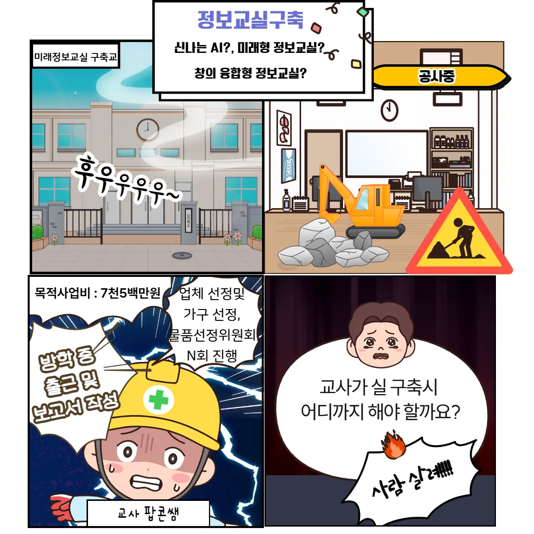 또한 비싼 물품을 구매하고자 할 때는 물품 선정위원회를 열어 선정해야 했습니다. 다들 물품 선정위원회 해보셨을까요? 한 물품에 대해 A, B, C의 제품을 찾고, 기능 및 설명을 스스로 찾아야 하는 상황에 맞닥뜨리자 여러 제품을 사고 싶어 했던 과거의 제 모습이 후회스러웠습니다. 그리고 바닥과 벽도 제가 고민해야 하는 상황인지 몰랐기 때문에 생각지도 못한 일들에 혼란을 겪었습니다. 예상했던 것 보다 컴퓨터실을 구축하기 위해 해야 할 선택이 너무 많았고, 행정실의 도움을 받긴 했지만, ‘이것까지도 내가 해야 하나?’ 싶었던 부분이 많았습니다. 특히 불용 처리를 진행하면서 ‘왜 컴퓨터실을 바꿔서 힘들게 하냐?’라며 행정실 특정 선생님께 질타도 받았습니다. 방학 때도 출근해서 줄줄이 도착하는 물품을 검수하고, 이상 있는 물품이 도착하면 업체에 연락했습니다. 힘든 점이 많았지만, 결론적으로 2023년에 구축된 미래형 교실에서 수업을 듣는 학생들을 보며 조금은 행복했답니다.