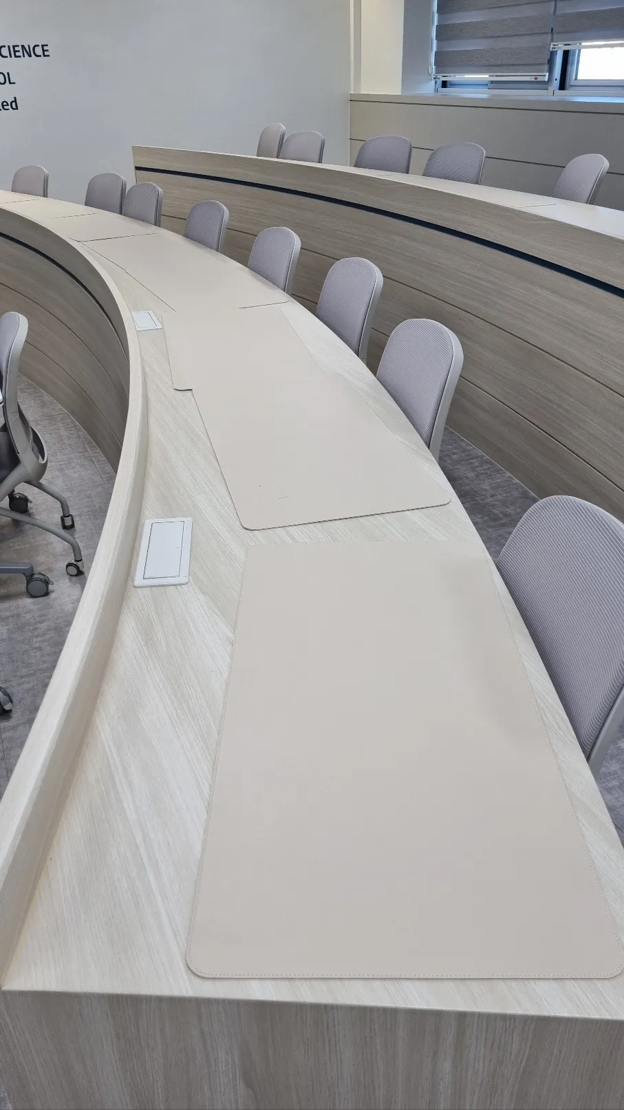 책상의 면적을 정할 때 고려한 사항입니다. 실제로 노트북을 두고, 기본서 한 권을 펼칠 수 있는 넓이의 책상을 골랐습니다. 강단이 있는 라운드 책상은 맞춤 가구로 제작하였는데요. 이 역시 노트북과 책을 놓을 수 있는 면적이 나올 수 있도록 고려했습니다.
