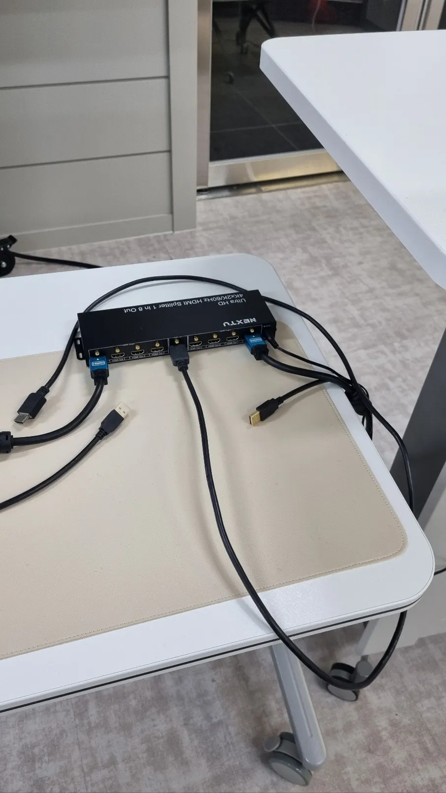 그리고 분배기도 구입해 두어 두 개를 붙여 놓으면 두 개의 전자 칠판에 동시 화면 송출을 할 수도 있습니다. 분배기가 같은 회사의 제품이라면, 유선이 아니더라도 무선으로 묶어서 화면을 제어할 수 있는 기능도 있습니다.