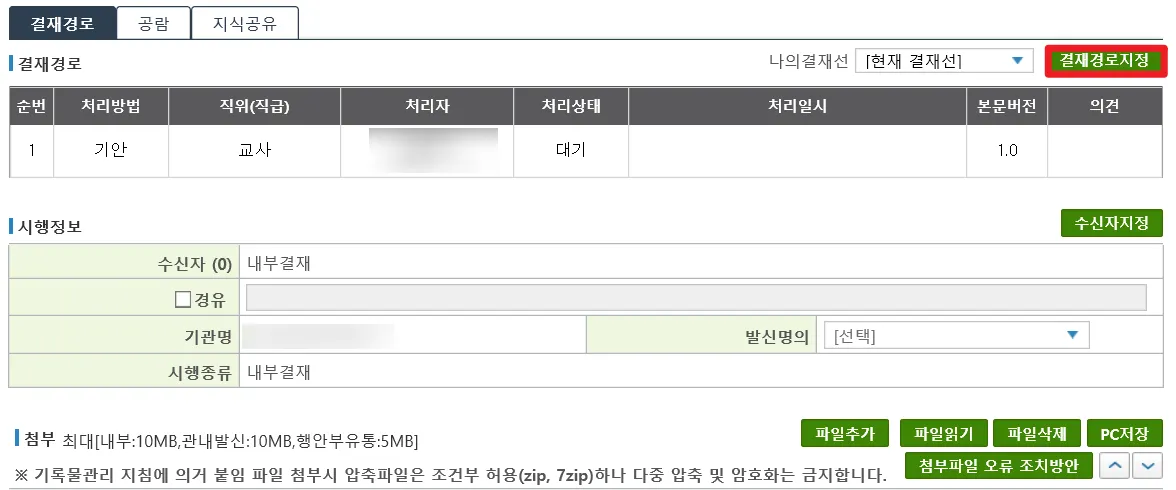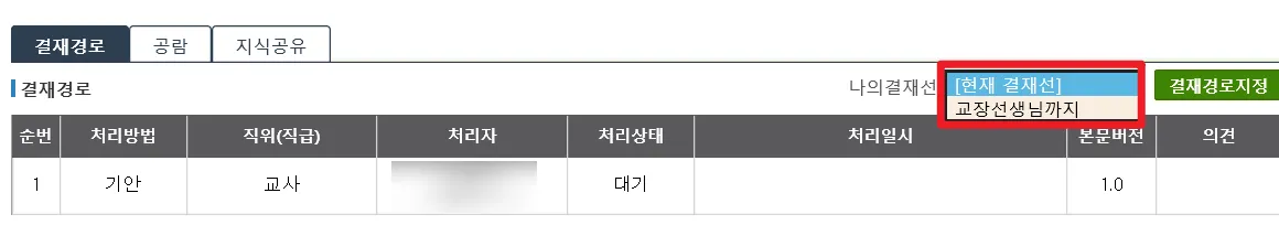 결재선은 학교마다 다르기 때문에 상신 전에 확인하시고 올리셔야 합니다.