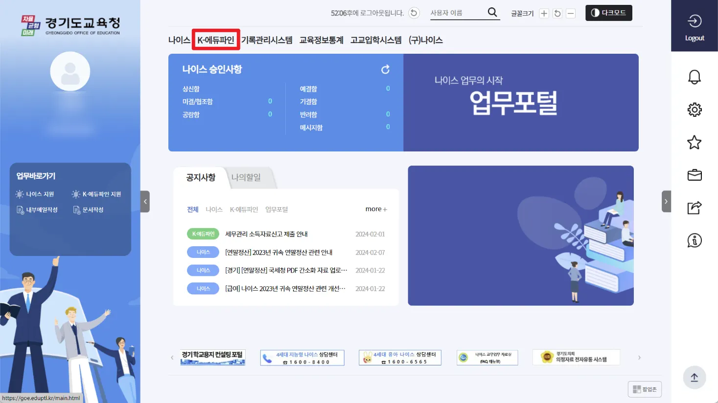 대부분의 학교 업무는 업무포털에서 이루어집니다. 업무포털은 교육청마다 조금씩 차이가 있지만 저는 제가 근무하는 경기도교육청 업무포털을 기준으로 설명해 드리겠습니다.