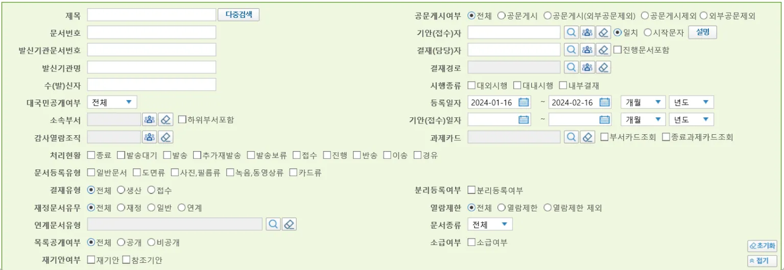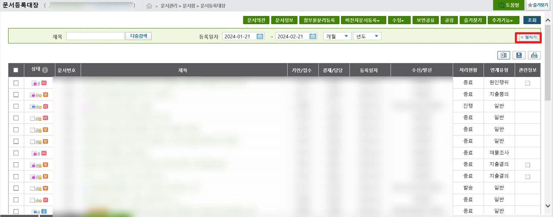 문서등록대장에서 펼치기 버튼을 클릭하면 자세하게 검색할 수 있고 작년 공문을 검색하시기 전에는 반드시 등록일자를 확인하셔야 합니다.