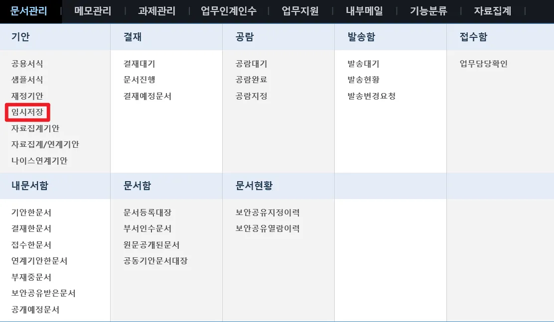 이렇게 임시저장한 공문은 문서관리-임시저장에서 확인할 수 있습니다.