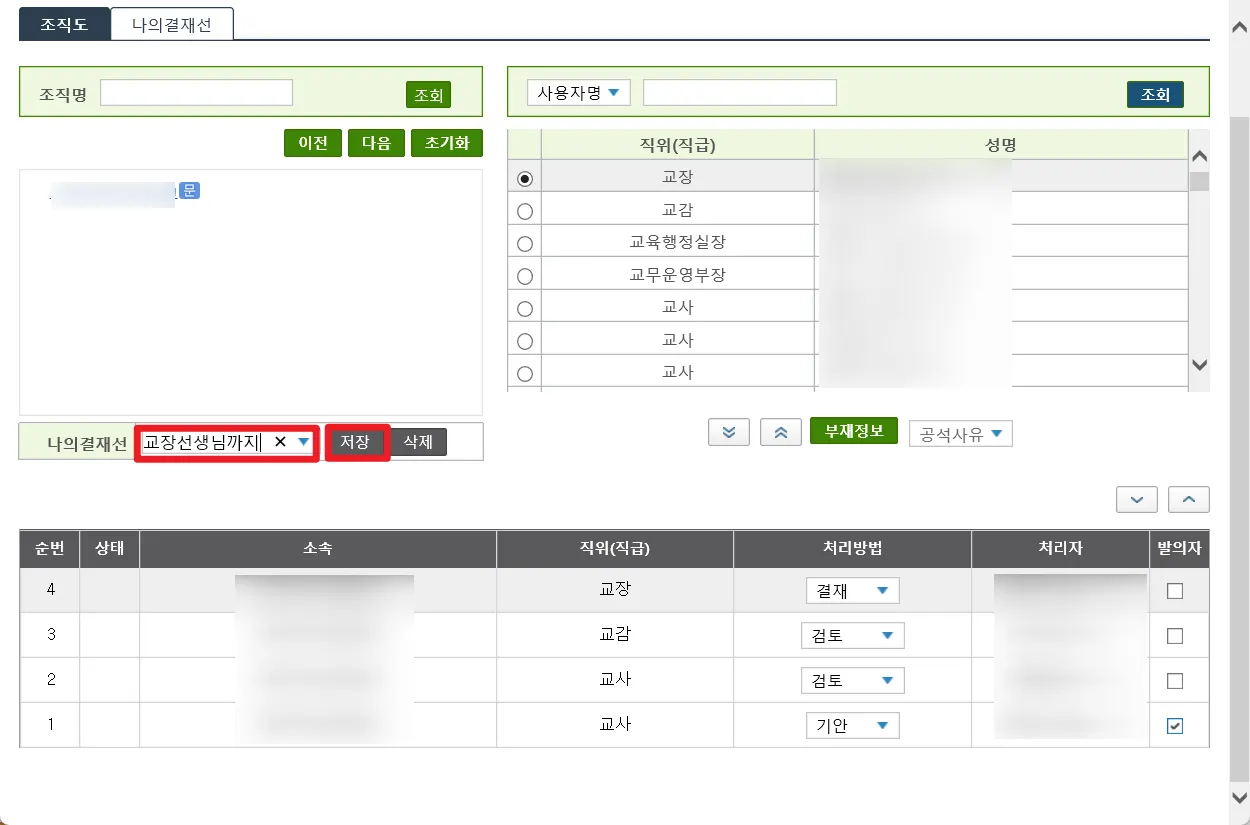 결재자 지정을 클릭한 후 아까와 같이 교무부장님, 교감선생님을 선택하고 저장 버튼을 누르시면 됩니다.