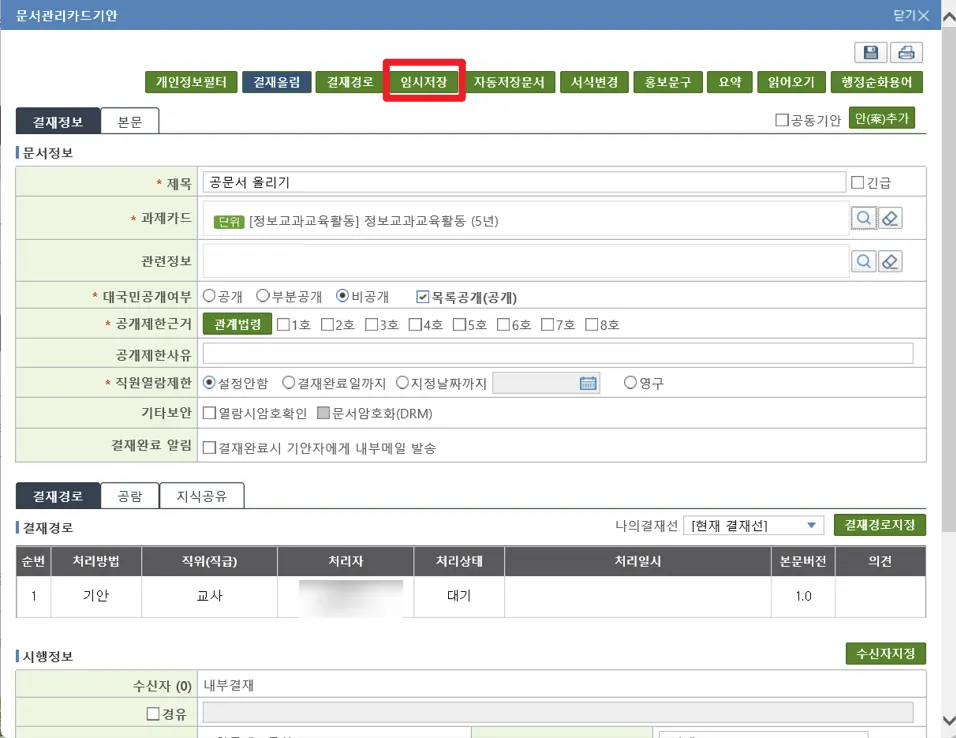만약 정보부 업무를 하신다면, 매달 올려야 하는 공문이 있을 수 있고 담임일 경우 학생들의 인적 사항만 변경해서 올리는 공문이 많기 때문에 임시저장해서 사용하시면 편합니다.