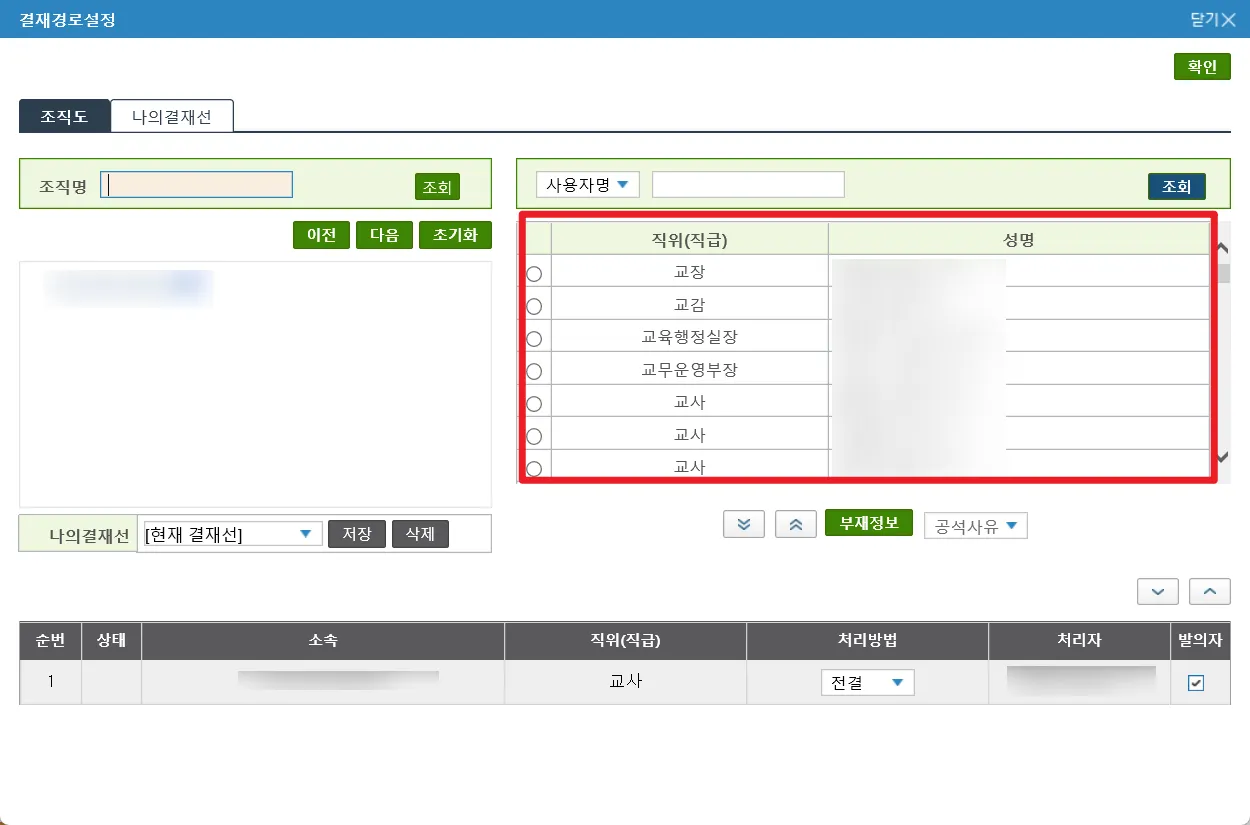 결재경로설정 창이 열리면 여기에서 결재선을 선택합니다. 만약 정보부장님-교감선생님-교장선생님 으로 결재하신다면 목록에서 찾아 더블클릭하면 아래쪽으로 이동하게 됩니다.