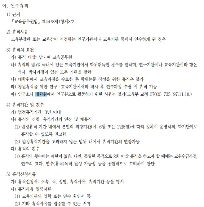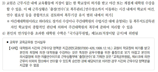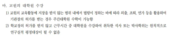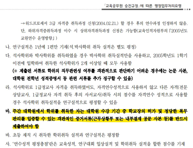 나아가 혹시 대학원 학위 취득의 목적이 승진이라면, 반드시 학교장의 허가를 받아야 합니다. 보통은 18시 수업을 위하여 일과 시간보다 조금 더 빨리 나가야 하는 경우가 발생합니다. 하지만, 인사실무편람에 따르면 학교장 허가 없이 근무시간 중 대학원을 수강하여 취득한 석사 또는 박사 학위는 원칙적으로 연구실적 평정대상이 될 수 없기 때문입니다.