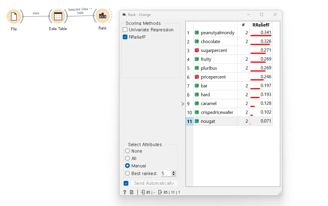 RReliefF 알고리즘은 데이터셋의 타겟 변수를 예측하는 데 각 특성(Feature)의 중요도를 평가하는 방법으로 사용됩니다. 이 알고리즘은 각 특성에 RReliefF 가중치를 할당하여, 해당 특성이 타겟(Target, 그림3 에선 승률(winpercent)) 변수 예측에 기여하는 정도를 수치적으로 나타냅니다.