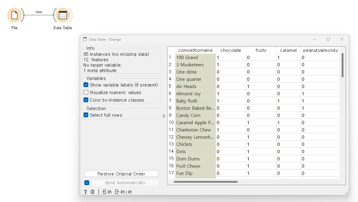 ‘Tree’ 위젯을 사용하여 이진 변수를 기반으로 결정 트리를 만들고, 사탕의 승률을 예측합니다.