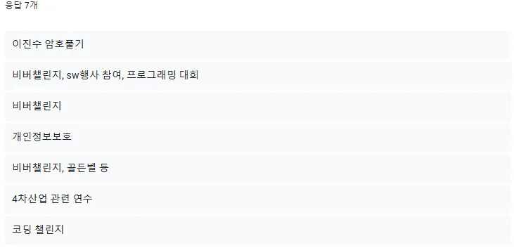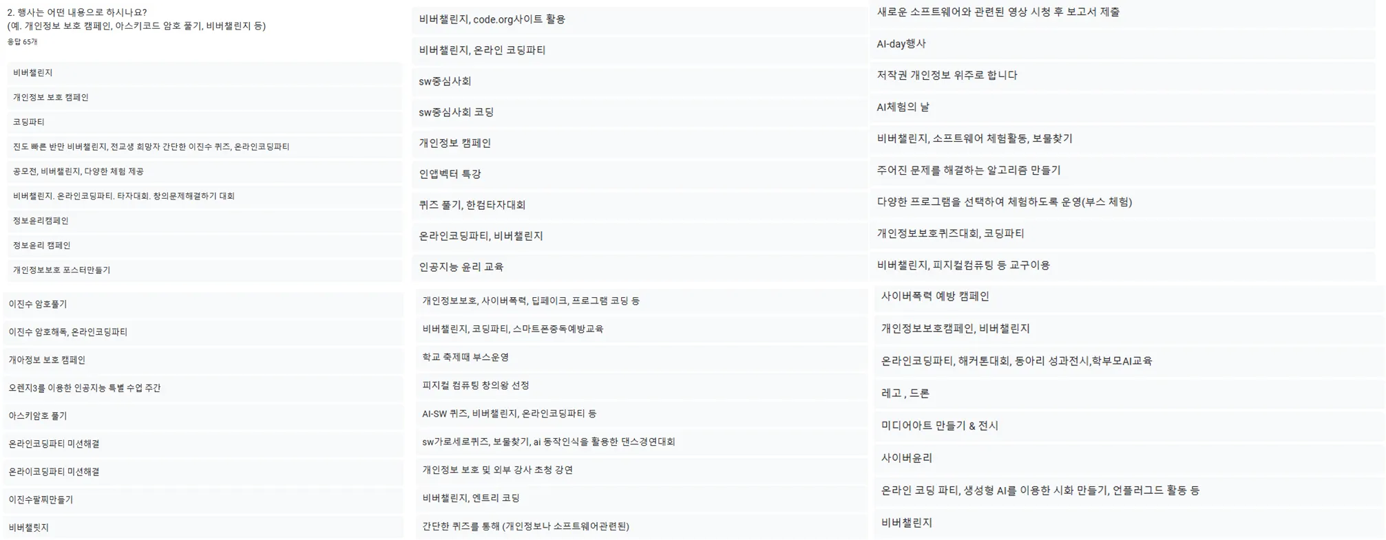 설문 응답 결과 자료를 정리해 보며 정보 선생님들께서 다양한 방법으로 활동을 진행하시는 것을 다시 한번 깨닫게 되었고, 저도 내년부터 소프트웨어의 날을 내실 있게 운영해 보려고 합니다.