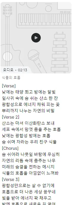 역사 시간에 배운 역사적 인물의 업적에 대한 노래를 만들거나, 과학 시간에 배운 내용에 대한 노래를 만들도록 하였습니다. 만든 작품 중 가장 괜찮은 작품을 패들릿에 노래와 가사를 업로드하도록 하였습니다. 아래 그림은 한 학생이 생성형 AI로 만든 일부 가사입니다.