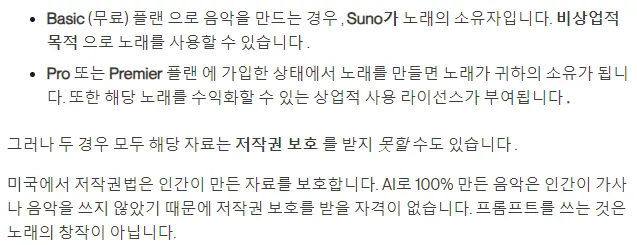 생성형 AI를 사용하기 전 학생들에게 저작권 관련 주의사항을 안내하였습니다. 아래 그림은 Suno 저작권 관련 일부 내용입니다.