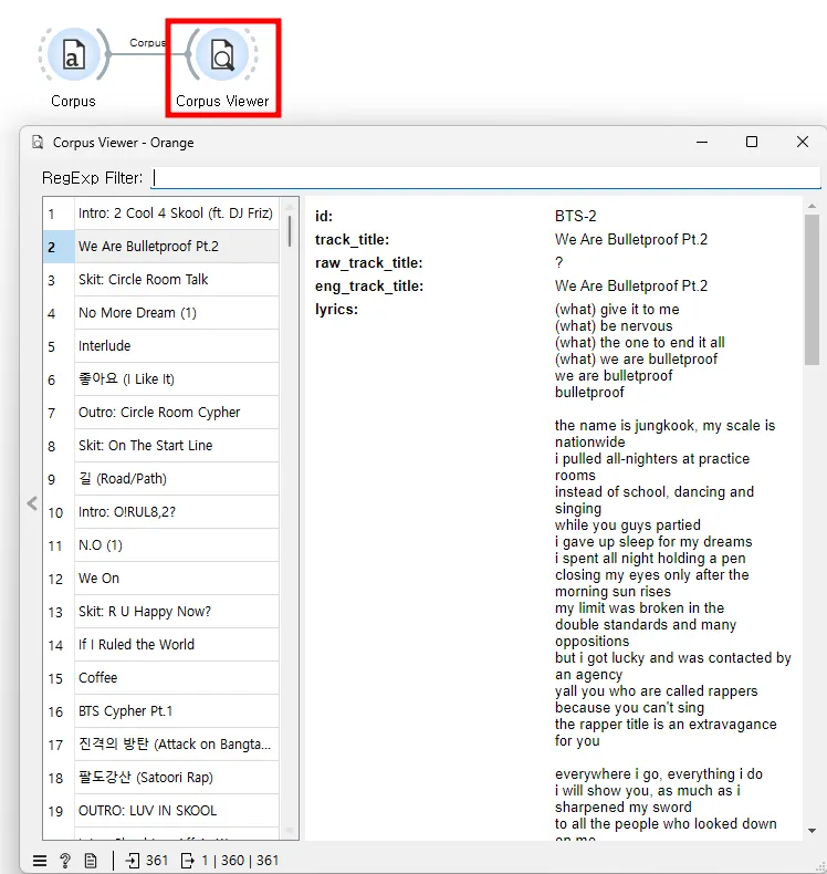 다음으로 [Corpus] 위젯을 [Corpus Viewer] 위젯과 연결한다. Corpus Viewer에서 BTS 데이터셋의 내용을 검토할 수 있다.