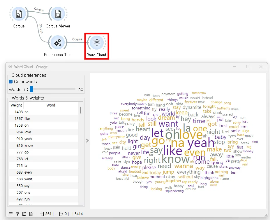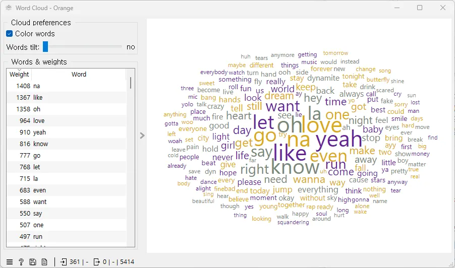 아래 워드 클라우드에서 ‘na’, ‘like’, ‘oh’, ‘love’, ‘yeah’와 같이 크게 표시된 단어들은 그 단어들이 가사 데이터셋에서 가장 자주 등장하는 단어임을 나타낸다. ‘na’가 1,408회, ‘like’가 1,367회 등장하는 것처럼 각 단어의 빈도는 워드 클라우드의 왼쪽 패널에 'Weight'으로 표시되어 있다.