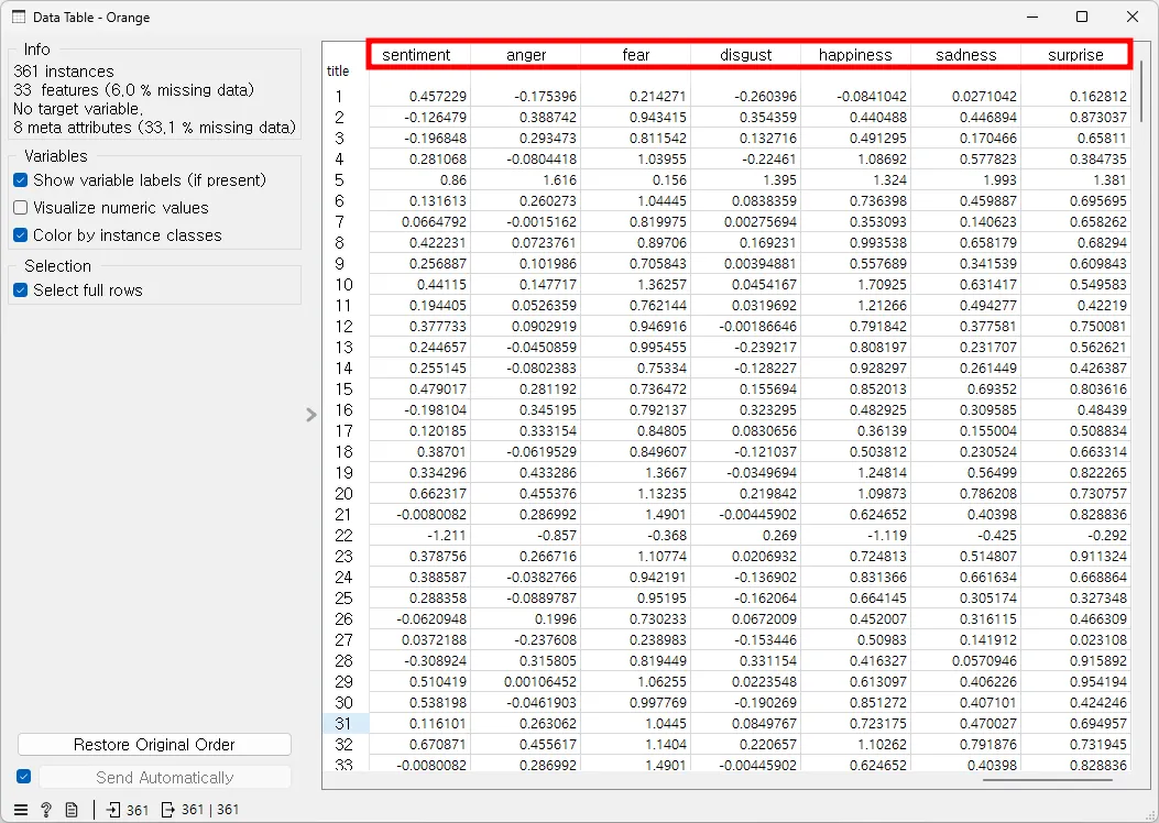 [Sentiment Analysis]를 ‘SentiArt’로 설정하고, [Data Table]을 연결하여 감정을 분석한 결과를 살펴보자.