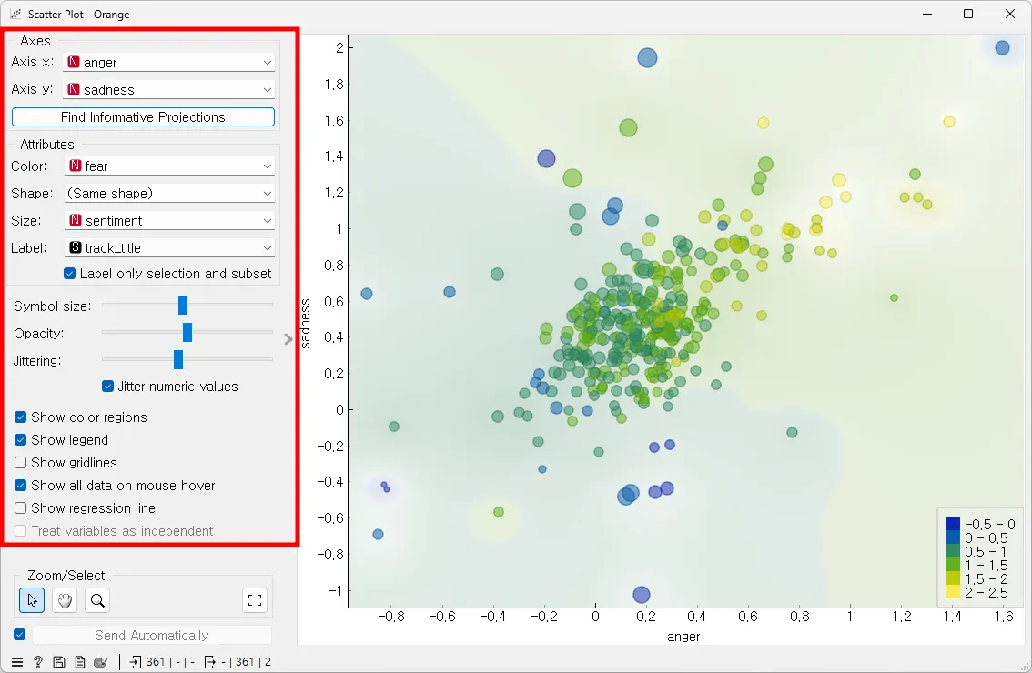 [Data Table]에 [Scatter Plot]을 연결하고, 아래 이미지처럼 설정하면 각각의 곡이 어떤 감정을 표현하고 있는지 쉽게 살펴볼 수 있다.