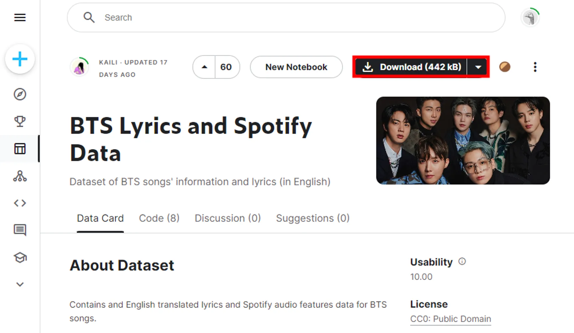캐글 사이트에서 'BTS Lyrics and Spotify Data'라는 가사 데이터셋을 다운로드한다.