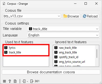 text features에서 텍스트 분석에 사용될 기능들과 텍스트 분석에 사용되지 않을 기능들을 선택한다. (두 상자 사이에서 드래그 앤 드롭으로 변수를 옮기거나, 표시되는 순서를 변경할 수 있음)