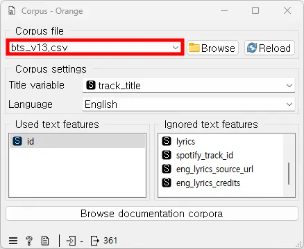 Text Mining-Corpus 위젯을 끌어온 후 클릭하여 ‘bts_v13.csv’ 파일을 불러온다.