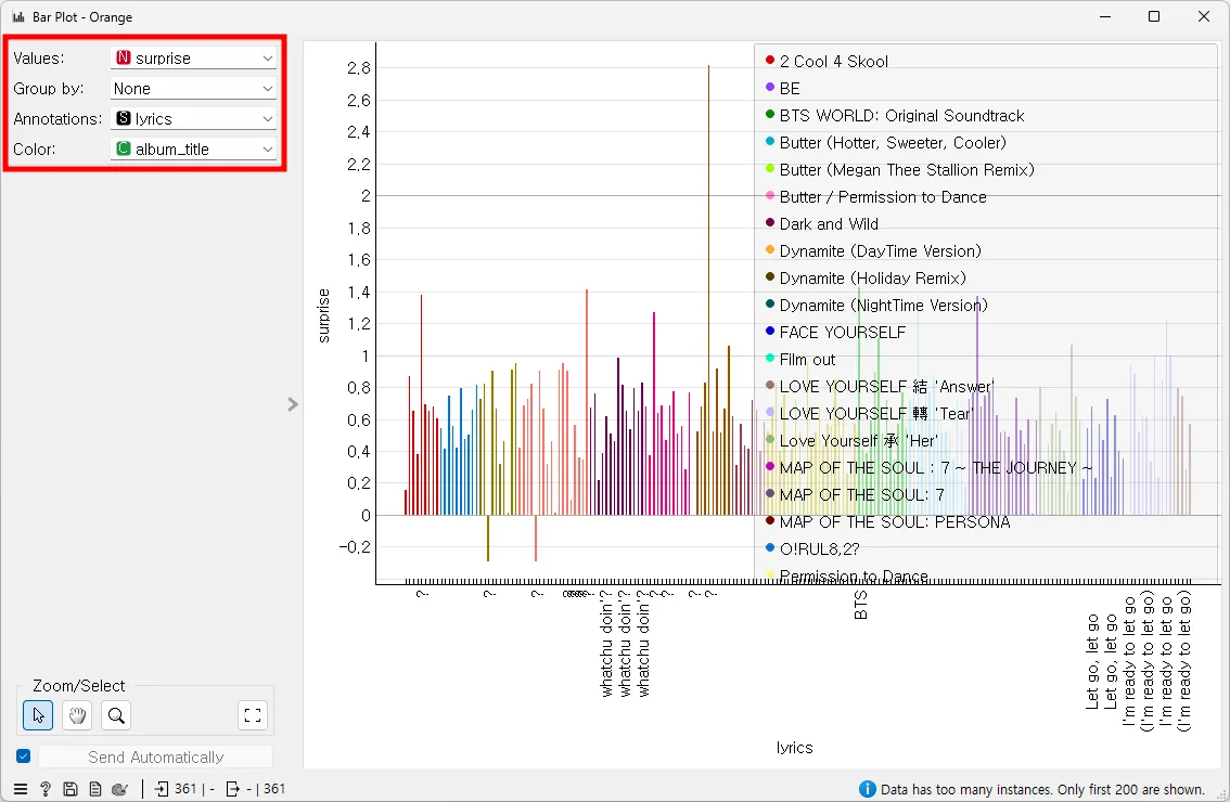 [Bar Plot] 위젯은 데이터를 막대그래프로 시각화해 준다. 이 그래프는 각 데이터 포인트에서의 놀라움의 정도를 'surprise' 속성을 기반으로 막대의 높이로 표현함으로써 특정 변수에 대한 분포를 시각화하고 있다. 막대의 색상은 'album_title' 속성에 따라 달라져, 각 앨범에서 놀라움의 정도를 쉽게 구분할 수 있게 해준다.