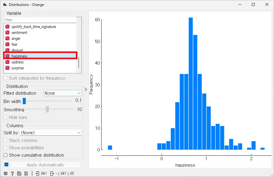 [Distrubutions] 위젯은 데이터를 히스토그램으로 시각화해 준다. 해당 히스토그램은 'happiness' 변수의 데이터 분포를 나타내며, 데이터 포인트(BTS 곡)들의 행복의 정도를 시각적으로 분석할 수 있게 해준다. X축은 'happiness' 값이며, Y축은 해당 값들이 나타나는 빈도수이다. 각 막대는 'happiness' 값의 특정 범위에 해당하는 데이터 포인트들의 수를 나타낸다. 분석 결과, 대부분의 'happiness' 값은 0.3에서 0.9 사이에 집중되어 있음을 확인할 수 있다. 특히, 0.6에서 0.9 사이의 구간에 가장 많은 데이터 포인트가 위치해 있으며, 이는 데이터셋 내에서 해당 범위의 행복감이 가장 일반적임을 보여준다. 또한, 매우 높은 'happiness' 값(예: 2.0 이상)과 매우 낮은 값(예: -0.6 이하)은 상대적으로 드물게 나타나는데, 이는 비교적 드문 사례이거나 특이한 데이터 포인트일 가능성이 있다.