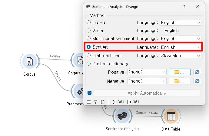 [Sentiment Analysis] 위젯은 텍스트로부터 감정을 예측하는 기능을 제공한다. 이 위젯은 여러 가지 감정 분석 모듈을 사용하여 각 문서의 감정을 분석하고 결과를 코퍼스에 추가한다. 사용 가능한 모듈에는 Liu & Hu, Vader, 다양한 언어를 지원하는 다국어 감정 사전, SentiArt, LiLaH 등이 포함되어 있다. 이러한 감정 분석 도구를 통해 문서에 대한 긍정적, 부정적, 중립적 점수를 계산하고, 이러한 점수를 데이터 분석과 시각화에 활용할 수 있다.