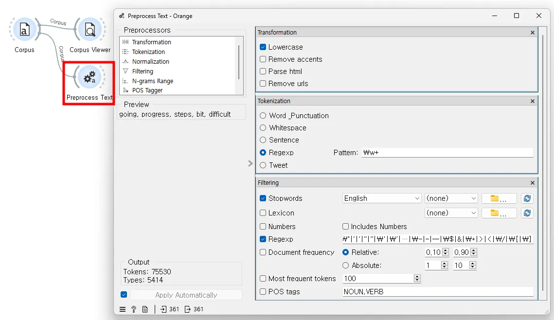 데이터셋을 [Corpus Viewer]로 확인한 후에는 [Preprocess Text] 위젯을 연결한다.