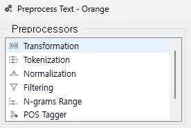 [Preprocess Text] 위젯은 텍스트 데이터를 분석 전에 준비하는 데 사용되며, 주된 목적은 불필요한 정보를 제거하고 데이터를 분석에 적합한 형태로 표준화 및 구조화하는 것이다. 이를 통해 데이터 분석의 정확도와 효율성을 높일 수 있다. 우리는 이 과정에서 'Transformation', 'Tokenization', 'Filtering' 세 가지 프리프로세서를 사용할 예정이다.