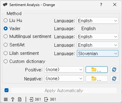 Liu Hu: 사전 기반 감정 분석으로, 영어와 슬로베니아어를 지원한다. 긍정적 및 부정적 단어의 합에서 차이를 계산하고 문서의 길이로 정규화하여 100을 곱한 최종 점수를 제공한다. 이 점수는 문서 내 감정 차이의 백분율을 나타낸다.