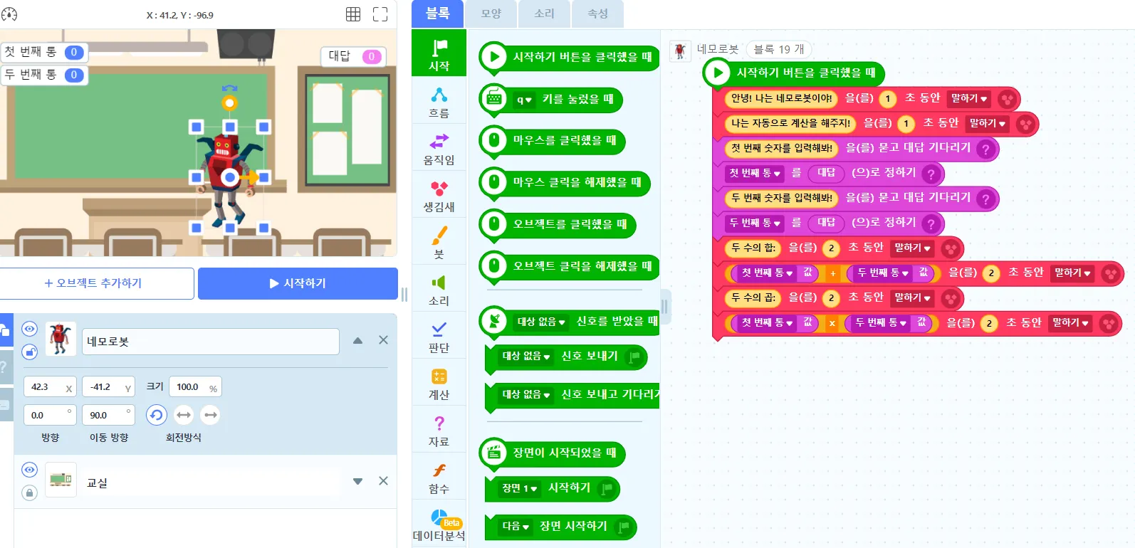 목표 상태 : 네모로봇 프로그램을 통해 더하기, 곱하기의 결과를 정확히 아는 상태